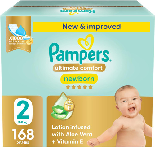 پوشک چسبی Pampers مدل Ultimate Comfort، حاوی لوسیون آغشته به آلوئهورا و ویتامین E، با تکنولوژی x1000 Leak Locks برای محافظت در برابر نشتی، بسته اقتصادی بزرگ (168 عددی)